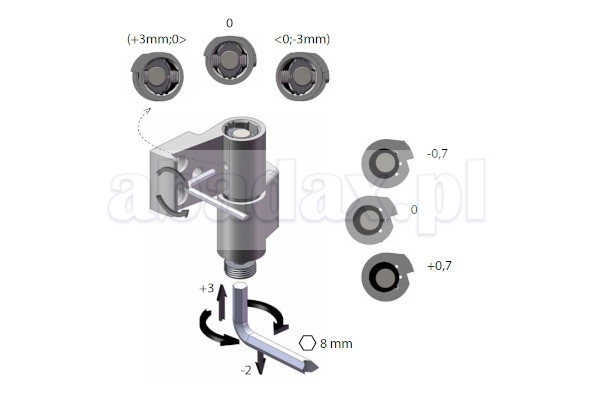 Posiadają regulację wzdłużną +3/-3mm, docisku +0,7/-0,7mm, wysokości +3/-2mm.